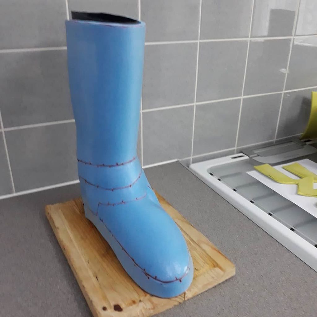 Making boots for me isn’t as simple as for most cosplayers, I can’t get a normal boot on due to my ankles not bending much and anything too heavy is painful, they also need to be easily removed by others, so I’m pretty much limited to craft foam. Our first attempt this time was buying some cheap plaster of Paris from amazon, we’d make a mold of my legs then use this to shape the foam, this failed badly with the plaster refusing to set, either user error as we hadn’t done this before or the plaster of Paris bandages were low quality. The next attempt was moldind the foam around some Wellington boots, this didn’t work either with lots of creases and the shape not holding.